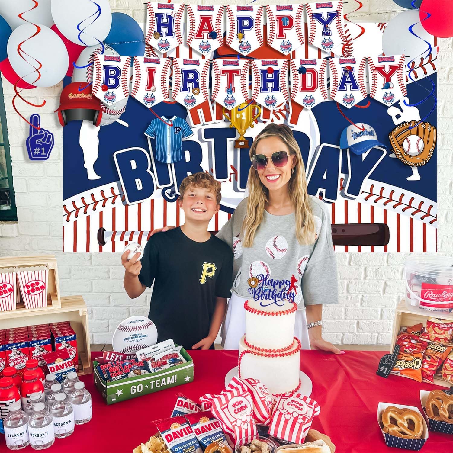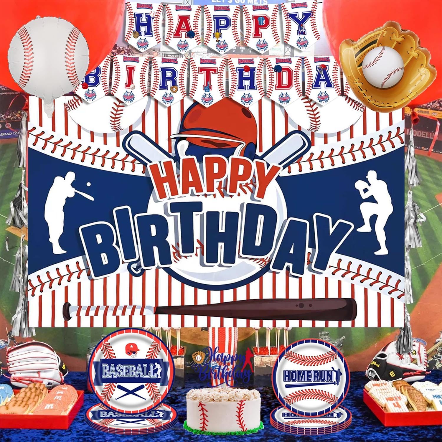 BASEBALL BIRTHDAY DECORATIONS:Our baseball decorations set includes 20pcs 9 inches paper plates , 20pcs 7 inches paper plates, 20pcs napkins, 20pcs knives, 1pcs cake topper, 24pcs cupcake toppers, 1pcs tablecloths, 1pcs backdrop, 1set happy birthday banner, 50pcs stickers, 6pcs hanging swirls, 4pcs foil baseball balloons, 16pcs latex balloons, almost everything for baseball party decorations BASEBALL DESIGN:Featuring baseballs, bats, gloves, and classic field graphics, these plates instantly upgrade your table setting, creating an energetic and festive atmosphere that’s perfect for birthday party HIGH QUALITY:Disposable baseball plates are made from thick, high-quality paper and printed with food-grade, water-based ink, ensuring they are safe for food contact. The balloons, crafted from natural latex, can be filled with air or helium, are durable, and resistant to bursting, ensuring a safe and fun party experience WIDE APPLICATION:These baseball party supplies are ideal for birthday parties, team banquets, school events, game-day parties, and more. Whether you're decorating for a boy’s birthday or hosting a sports celebration, our baseball birthday party decorations deliver the perfect themed atmosphere